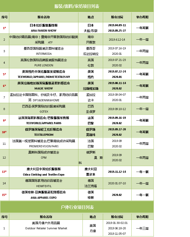 2019-2020年出國展覽計劃(行業)
