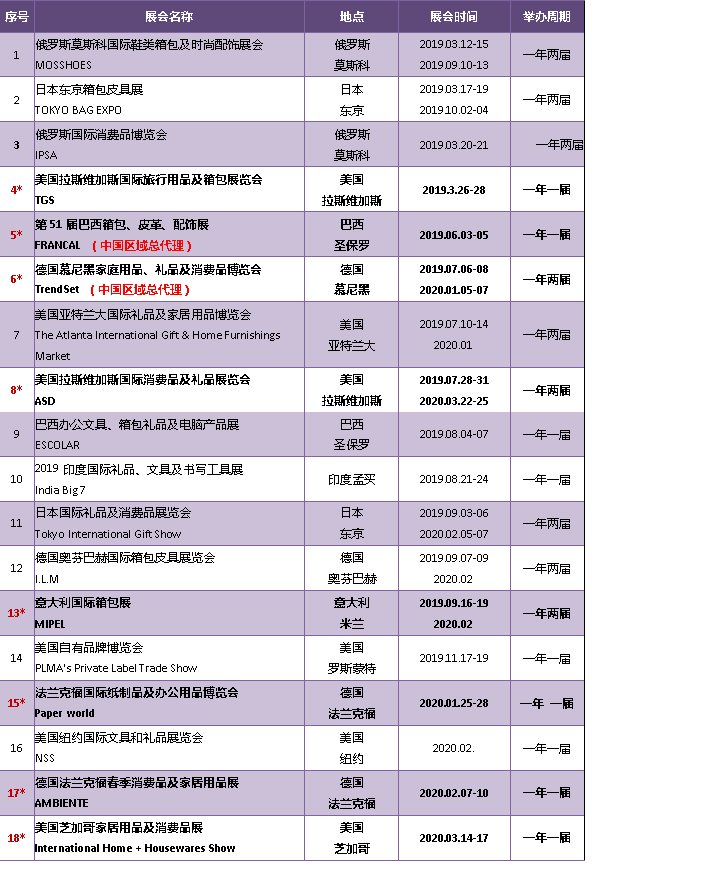 2019-2020年箱包/辦公文具/消費品禮品及家庭用品類 展覽計劃